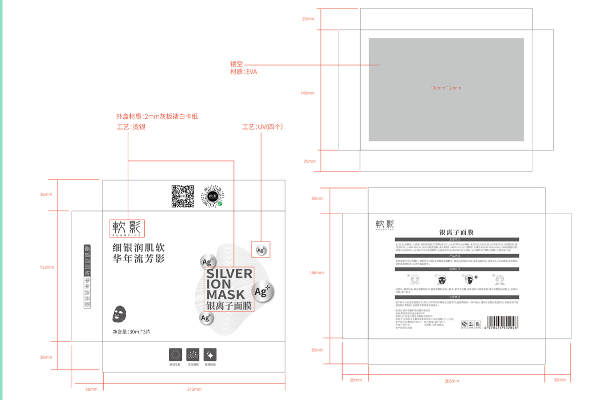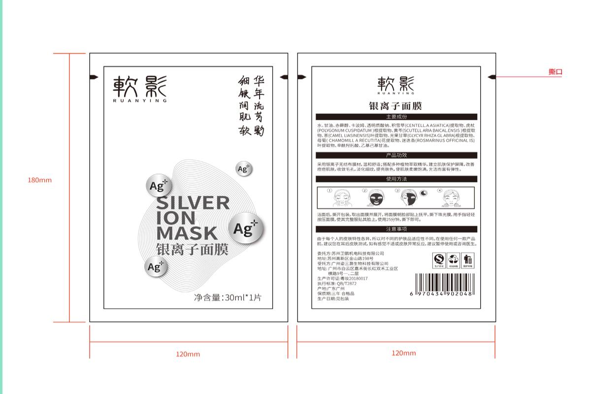 【品牌介紹】銀離子面膜|抗痘消炎凈膚,銀離子面膜,通過特殊的處理,將納米銀覆著在無紡布上,不間斷的釋放出銀離子,提升膚色,使肌膚飽滿,光潔而有彈性,整個包裝設(shè)計考慮到銀離子的特性,色彩以銀色為準,加上凹凸和燙銀的工藝,彰顯品質(zhì)感。