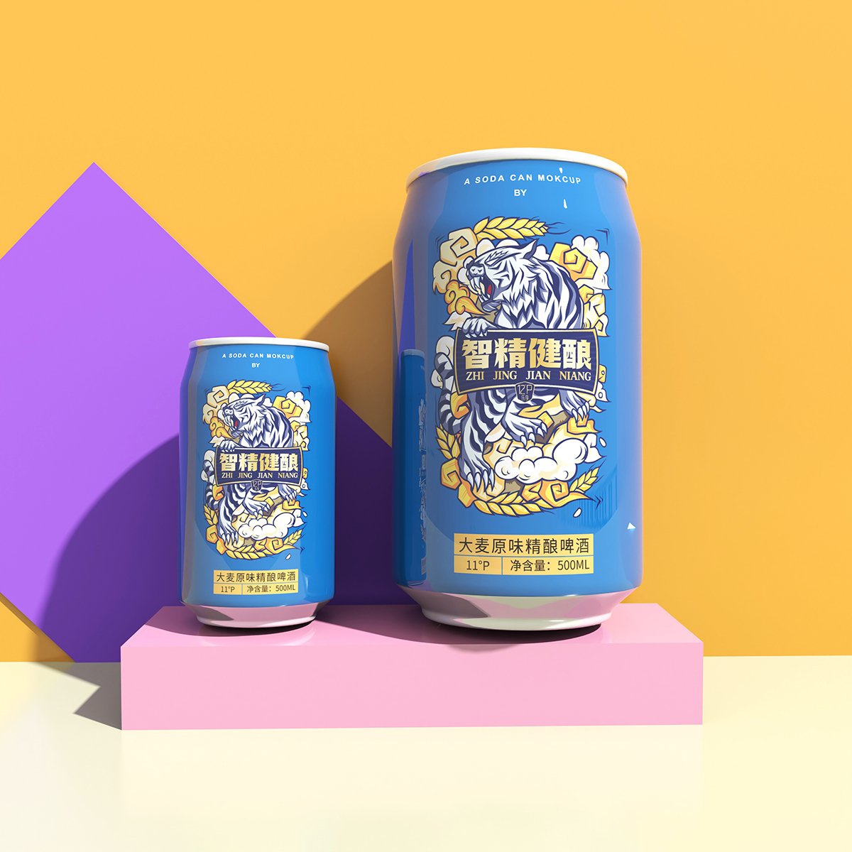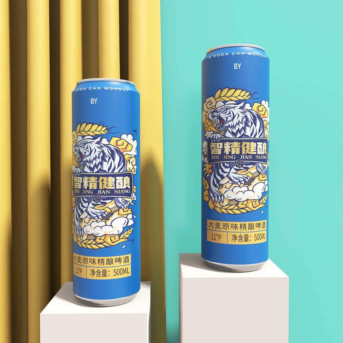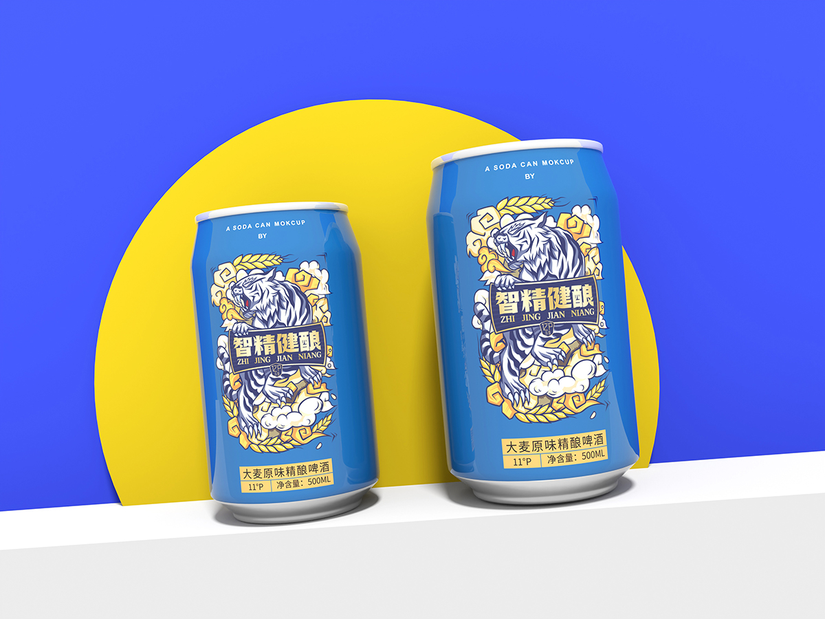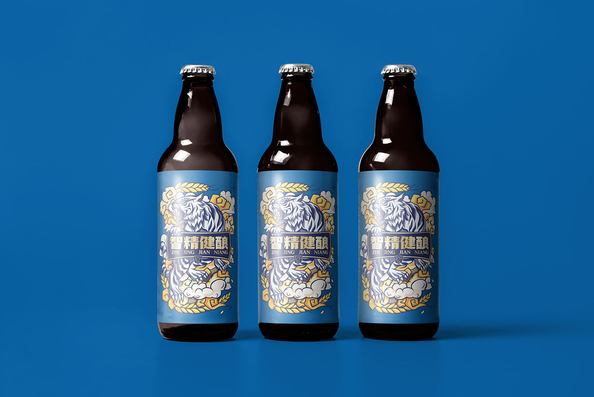 精釀啤酒虎圖騰包裝設(shè)計(jì):老虎是萬(wàn)獸之王,他是力量和威嚴(yán)的象征,是原始圖騰代表吉祥和幸福,最原始、最鮮活就是智精健釀的品牌含義,以虎為主題,配合麥穗、祥云等元素點(diǎn)綴,繪制畫出。