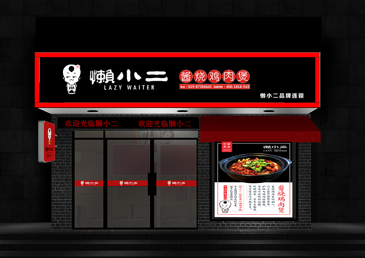 品牌介紹:懶小二醬香雞公煲品牌成立于2008年,自推出市場(chǎng)之日起在雞公煲行業(yè)就占據(jù)大量的份額,因此受到消費(fèi)者的一致贊賞和青睞,改公司為了滿足市場(chǎng),特邀請(qǐng)極地視覺(jué)進(jìn)行品牌設(shè)計(jì)及升級(jí),目前已在全國(guó)各大城市開(kāi)設(shè)加盟連鎖店。品牌已在許多城市有覆蓋,品牌影響力與日俱增。