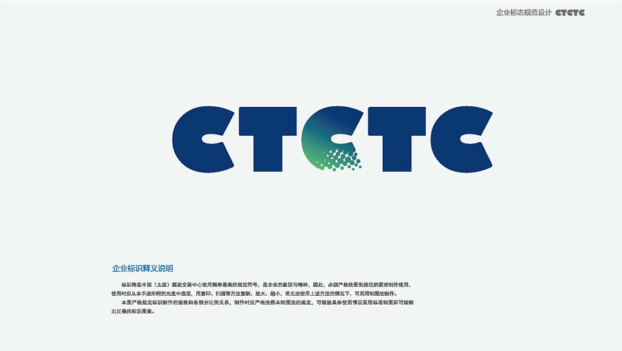 企業英文全稱字頭“CTCTC”作現代變體構成,使圖形外輪廓有“現代、科技、速度”的視覺意象,字體豐潤飽滿,在體現煤炭交易中心的深厚積淀與實力同時,亦傳達企業致力于“建立以全國煤炭交易中心為主體”及以網絡技術為平臺的核心理念。把握時代特色和時尚設計語言,以求與時代同步,使企業在同行業領域獨具特色并保持感人的親和力。