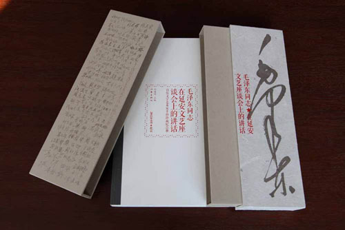 《毛澤東同志在延安文藝座談會上的講話》(百位文學藝術(shù)家手抄珍藏紀念冊)(作家出版社)手抄本,文字也是手抄風格,在設(shè)計排版方面十分成熟,很精煉,書脊用紙很好,重點內(nèi)容文字較大,一般內(nèi)容文字較小,層次分明;封面精致且大方,是一個盒子,恰似一個“豐碑”的形態(tài),很有層次感,有強烈的三維感;政策性的文字表現(xiàn)地不單調(diào)不枯燥,可以把文獻與文獻歷史巧妙地結(jié)合起來,很能使人產(chǎn)生親近感,是對政治性文件的革新,很有創(chuàng)新。