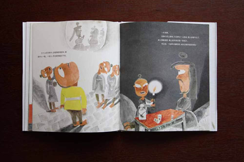 《穿墻術(shù)》(浙江少年兒童出版社) 繪圖表現(xiàn)力強,以暖色調(diào)營造了很好的氛圍;文字與繪圖協(xié)調(diào)一致,位置編排合理,圖片的視角一直在變化,富有節(jié)奏感;合和頁構(gòu)建了寬闊的閱讀空間,人物如同舞臺表演一樣,生動形象;版權(quán)頁與正文不放在一個合和頁上會更好,封面的紙板稍嫌厚重。