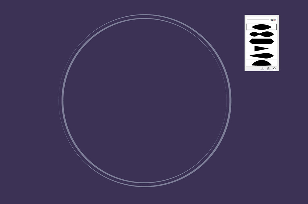 在畫板上繪制出矩形的背景,填充為暗沉的紫色。較暗的色彩比較能襯托出花朵的鮮艷。然后用圓形畫出兩個描邊空心圓,描邊大小為8px,線條配置為梭形。兩個圓形一個稍大另一個稍小些。這兩個圓所包圍的空間將是我們布局花朵的范圍。