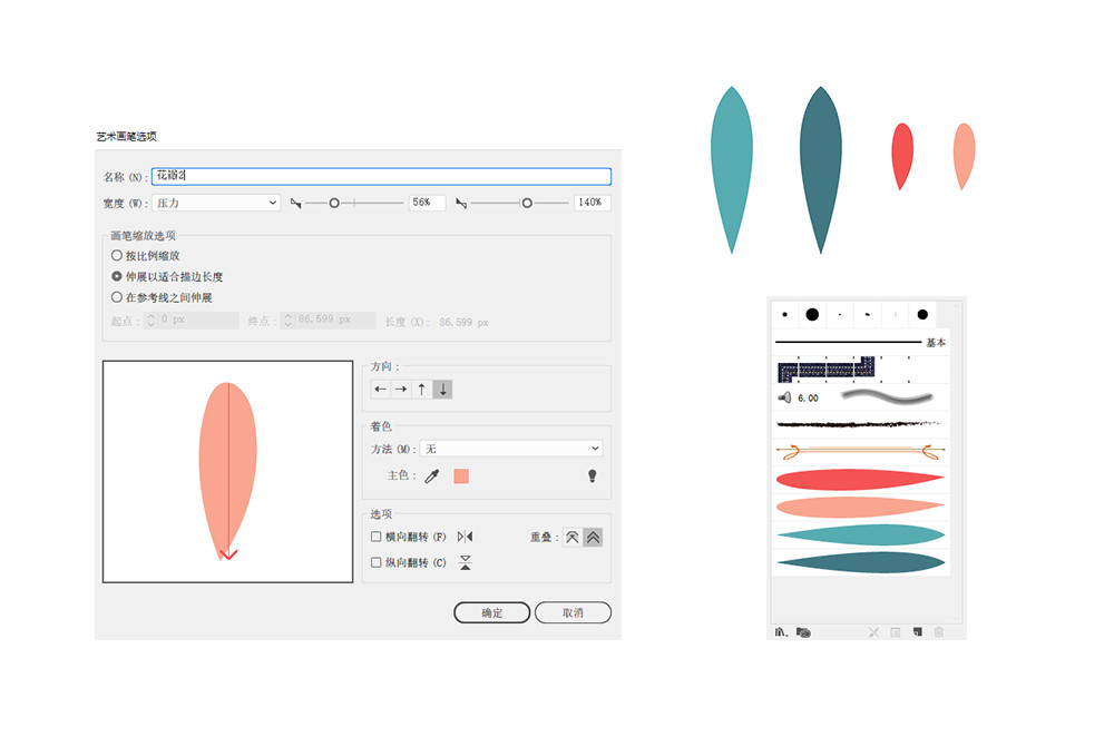 最開始就像準備符號一樣,讓我們用鉛筆工具畫出葉片和花瓣。然后將其分別拖入到畫筆面板中,彈出創建畫筆類型選擇為“藝術畫筆”,對藝術畫筆的選項參數進行設置,需要注意的是寬度可以選擇“壓力”,最小值和最大值都進行調整,并點擊確定。