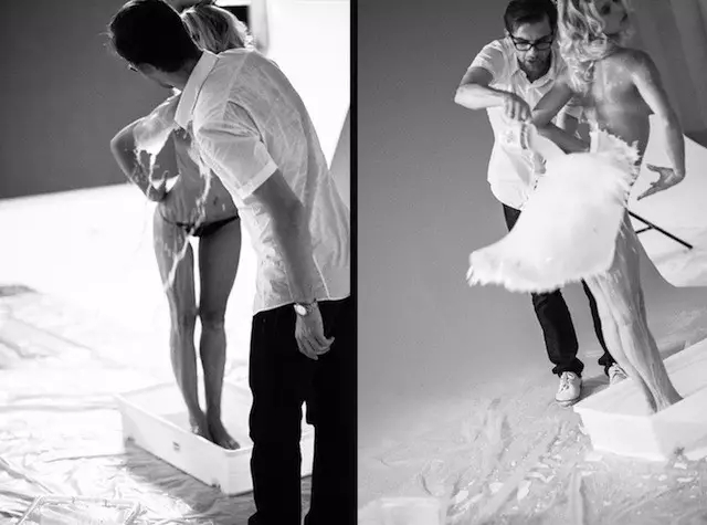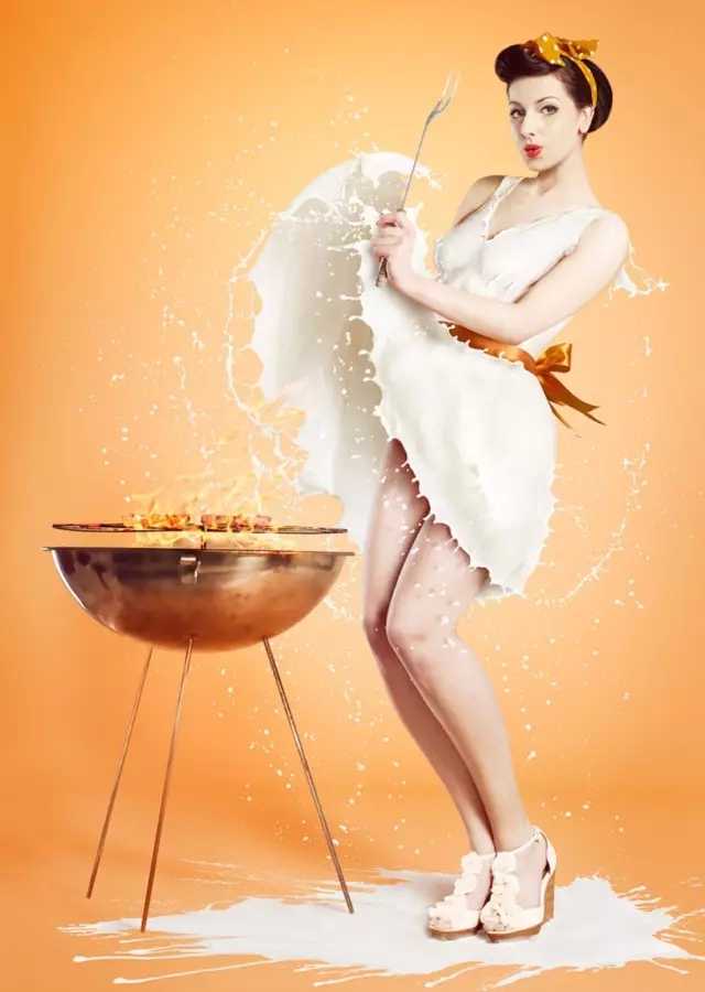 照片中,模特們大多被裝扮成上世紀“畫報女郎”的外形,牛奶順著她們的身體淌下,形成了一件件各具特色的美麗長裙。