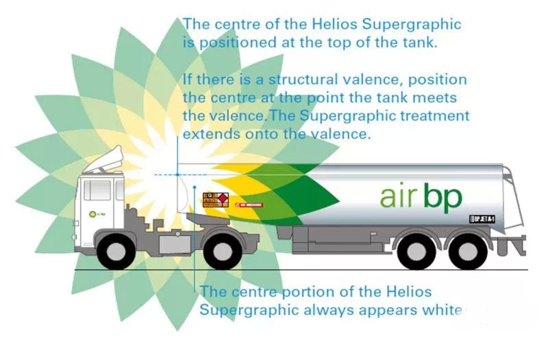 BP石油的品牌輔助圖形,就采用以“嚴格”標準截取“太陽花”品牌圖形標志局部的方式。