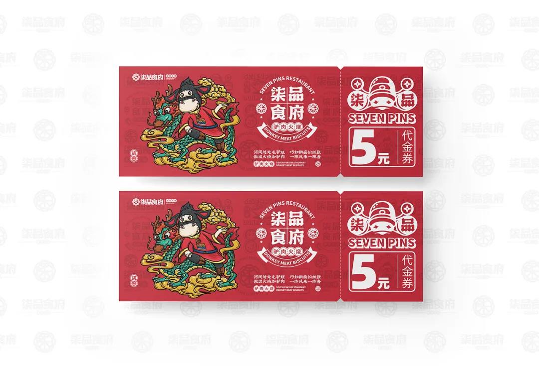 品牌根據品類塑造了一個驢IP,擬人化處理后的驢IP,形態更接近Q版,兩只驢耳朵向外伸展,隨著表情動作向上或向下伸展,很是靈動。傳統服飾在身,對驢肉火燒的歷史悠久進行不經意的刻畫。驢IP拿著不同的東西做出不同的動作時,形象就變得年輕起來了,十分有趣。驢IP與青龍、鯉魚、嫩豬以及小雞等具有中式代表性的動物進行搭配,創作出一幅幅國潮風插畫,是對美好寓意的向往和憧憬,也突出品牌的包容性和多樣性特點。品牌的輔助圖形就比較常見了,從標志和IP中延展,與文案和簡筆食材、菜品結合,以此更好的宣傳柒品食府這個品牌。