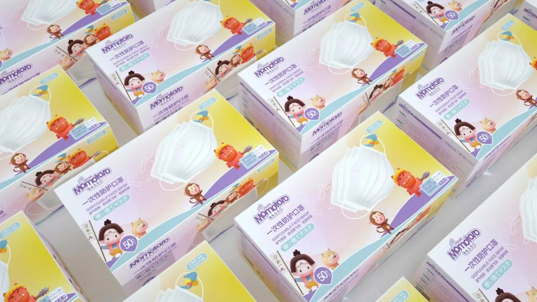 日式風格的口罩包裝,插畫IP靈感來自于日本五大童話之首《桃太郎》,生動勾畫出五個主要動畫形象,街知巷聞的故事性場景貼近生活。