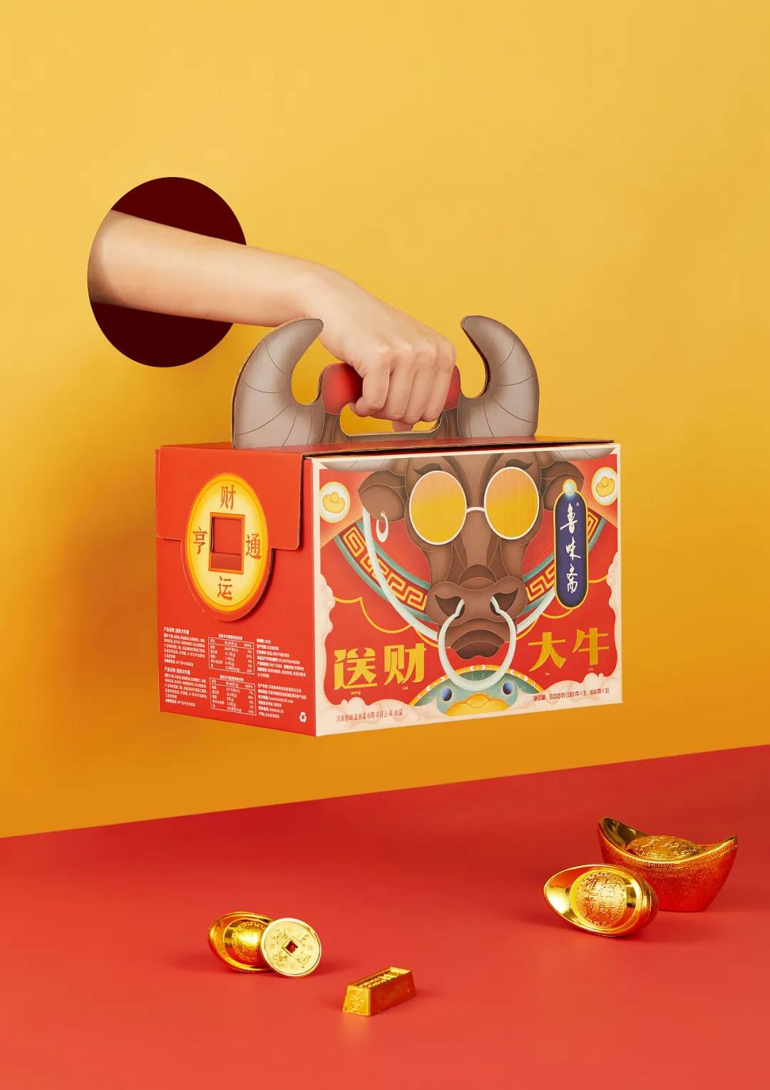 禮盒上的牛頭戴著一金色漸變眼鏡,就像看到金銀珠寶兩眼放光一樣,喜感又新潮,整個牛的形象令人記憶深刻。