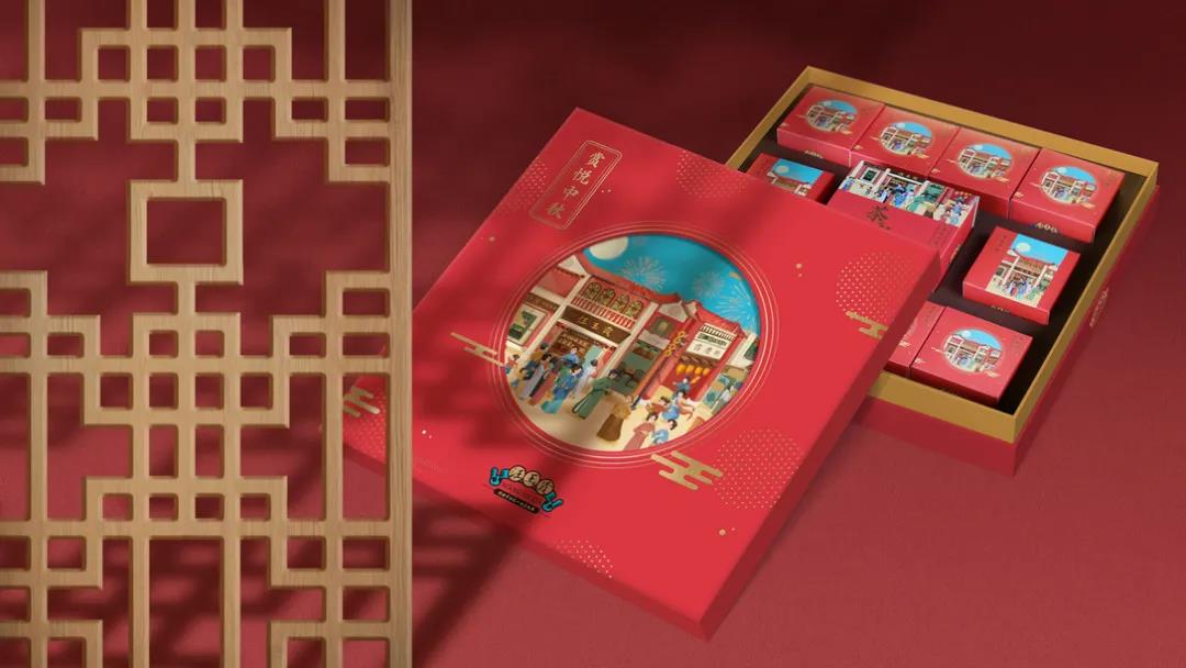 這款中秋禮盒包裝,首先外觀插畫采用了明快、簡潔的風格,描繪民國時期的商業街、小洋樓、,紅墻坡頂、雕花欄柱及彩繪玻璃等元素,再現那個時代的繁華景象。