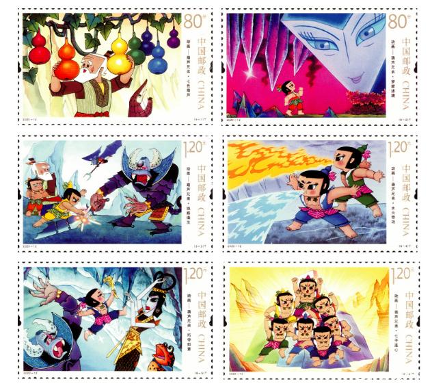 六一當天,中國郵政將發行750萬套《動畫——葫蘆兄弟》特種郵票一套6枚。郵票圖案名稱分別為:七色葫蘆、夢窟迷境、絕路逢生、水火奇功、巧奪如意、七子連心,