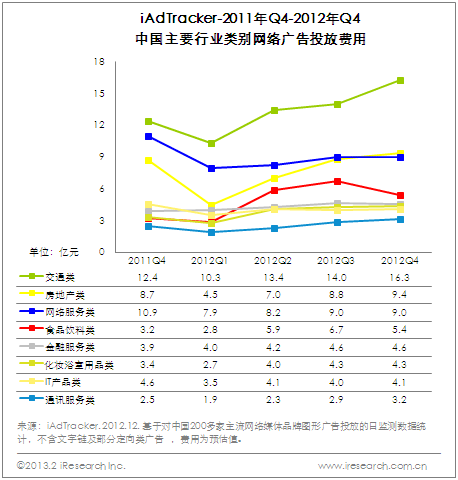 2013年網絡品牌廣告小幅增長可期 媒體類別間競爭微妙 根據艾瑞咨詢即將發布的《2012年第四季度數據產品監測報告》數據顯示,2012年Q4 網絡品牌廣告投放費用自2011Q1以來首次出現與上季度基本持平的局面,同比增長依舊明顯。2013年網絡品牌廣告投放費用維穩氛圍依舊濃厚,同時小幅的增長依舊可期。