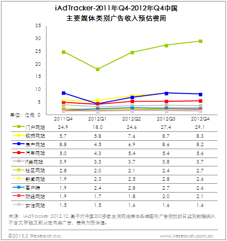值得注意的是,門戶網站廣告收入占比自2011Q2下降以來2012Q4首度上升。門戶網站與視頻網站、垂直網站的競爭依舊十分微妙。