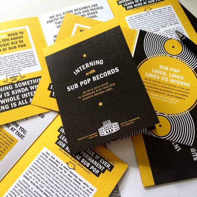 運用不同的配色方案,可以分離出若干內容,以及添加一些視覺上的趣味。上圖中,設計師 Sasha Barr 交替使用黑、黃以及背景的白為Sub Pop 唱片實習招牌設計了一款酷酷的信息指南。