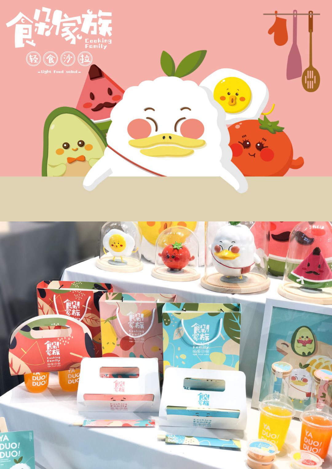 品牌將品牌的核心產品輕食沙拉中的牛油果、西紅柿、雞蛋等通過擬人化手法,設計出有趣有愛的吉祥物家族,塑造獨特的品牌視覺體系。每個吉祥物都設定了體現出相親相尊重的家庭相處之道。宣傳插畫以粉色及粉綠色為主色調,在海報加入LOGO元素,用粉嫩的色彩、擬人的方式,表現出蔬菜的特點和趣味故事。將所有產品都擺在一起,萌趣可愛的蔬菜形象吸引著消費者的視線,賦予了品牌親和力。
