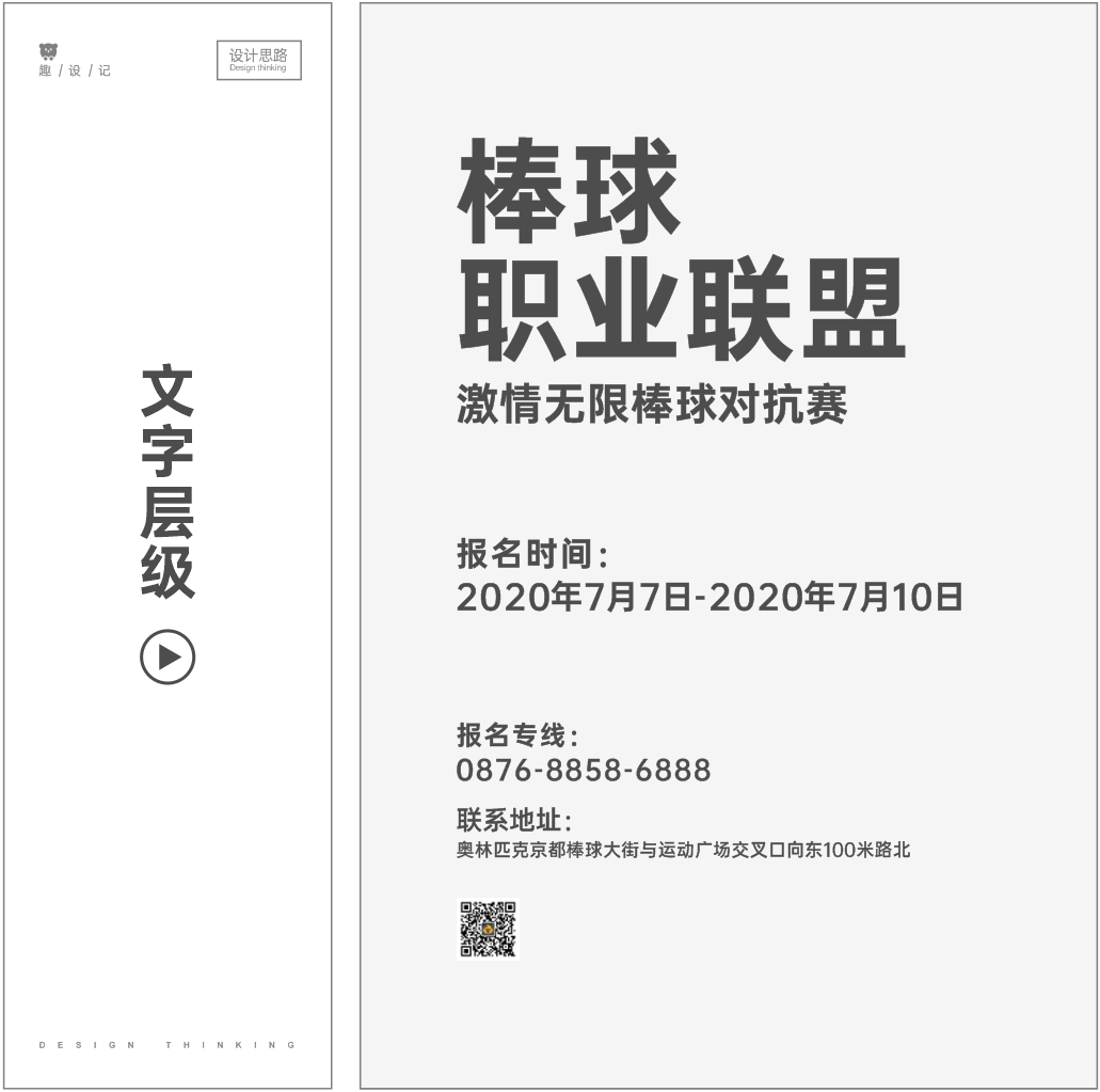 02 > 主體刻畫 。可以看出構圖里面是很多傾斜的方塊,那么結合剛才列出來的元素,我們可以選擇跟線類似的素材,很顯然,棒球棒就是一個不錯的選擇,剛好用來做法天象地。將棒球棍把灰色塊代替,畫面感實際就已經出來了。接著處理主標題,剛才說到要粗黑體,所以這里選擇字魂143號-正酷超級黑,搭配長型的英文翻譯,選用這個英文字可以很好的填補棒球右側的空間,而且并不會過于參差不齊。為了匹配整個畫面的動感趨勢,將主標題加上一些短橫線增加動感,再將副標題也搭配英文做個層次對比,這里需要注意主標題和副標題之間的間距。把主圖和主標題都放到畫面中,再將剩余信息的位置標出來。
