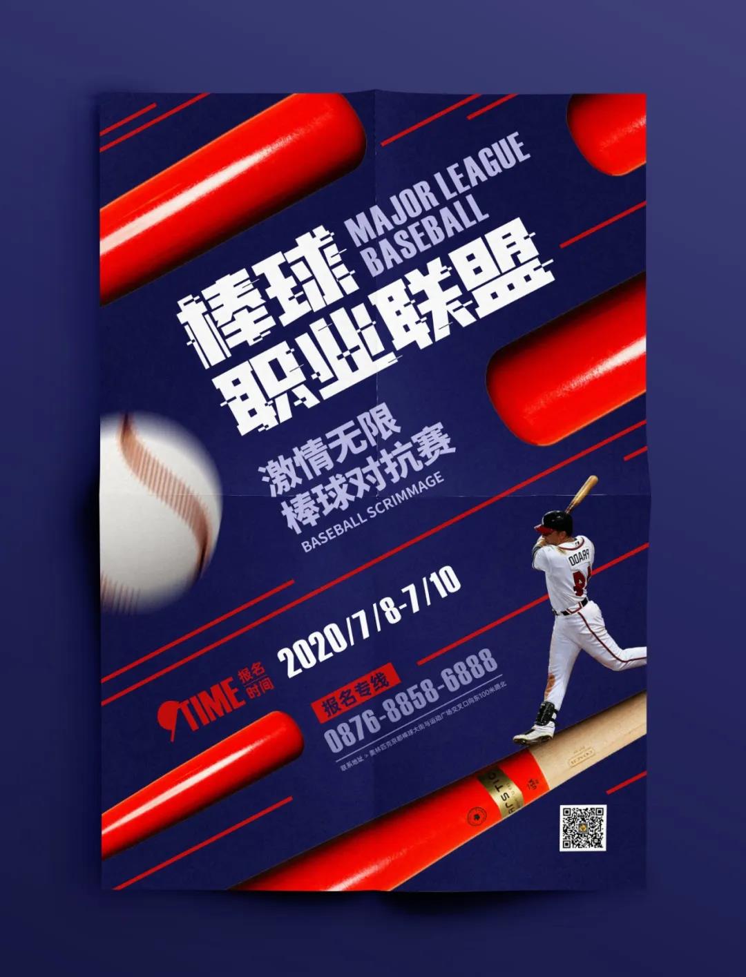04 > 優化版面 。接著我們來搭配顏色,剛才提到,運動類的海報可以選用深色的配色,所以以深藍作為背景,加上漸變,文字的色彩明度做一個區分,同時呼應紅色。最后我們可以看出畫面中還有空的位置,剛好加上一個主人物,形成特異(請忽略人物身上反過來的數字,我就是懶,不想處理),再加上一個動感的棒球,傾斜的線條來增強畫面氛圍,豐富畫面,海報就完成了。