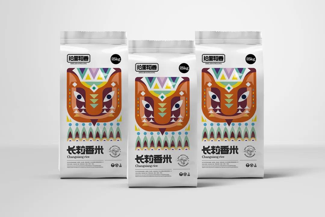 首先品牌根據產品的不同特性,分為三款風格包裝,整體夸誕而現代的設計,賦予包裝新的生命力。極簡白的外袋包裝下,封面采用了幾何圖形拼貼的形式,并以此抽象化為動物頭像,突出了大米生長地的代表性元素。