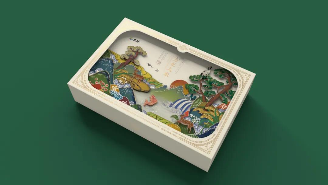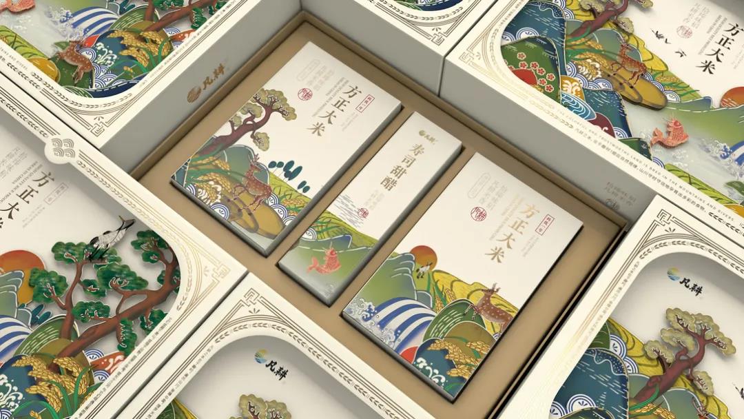 內盒不同大小盒型的設計,拼接的插畫又可形成完整的景觀畫面,呈現生態和諧的同時,強調了優質大米得天獨厚的生長環境。上方的文字信息以豎直排版呈現,主次分明的設計搭配金色印刻方式,進而大米包裝的品質感,便于消費者迅速捕獲產品特性。