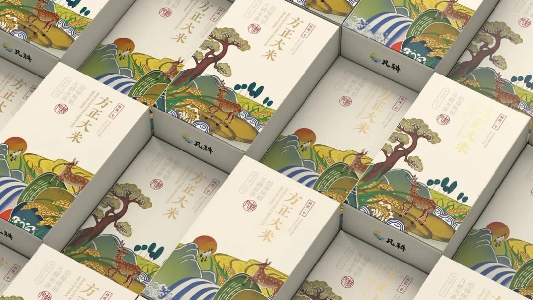 產自東北優質種植區域的凡耕大米,以“順應自然規律”為理念,憑借四季分明、雨水充足的自然條件,培育出天然、健康、優良的品質大米。首先外盒采用鏤空式設計,提取東方設計美學中常見的花紋元素,金色描邊更顯禮盒包裝的貴氣、優雅,讓消費者有種仿佛正在欣賞優秀畫作的感覺,增強整體包裝的立體感。插畫風的設計延續中國傳統美學底蘊,畫面融入了江河、田野、高山、野鹿等元素,低飽和度色調的運用營造溫馨的氛圍,日落西方的場景描繪結合米白色調,更能讓人沉浸其中。