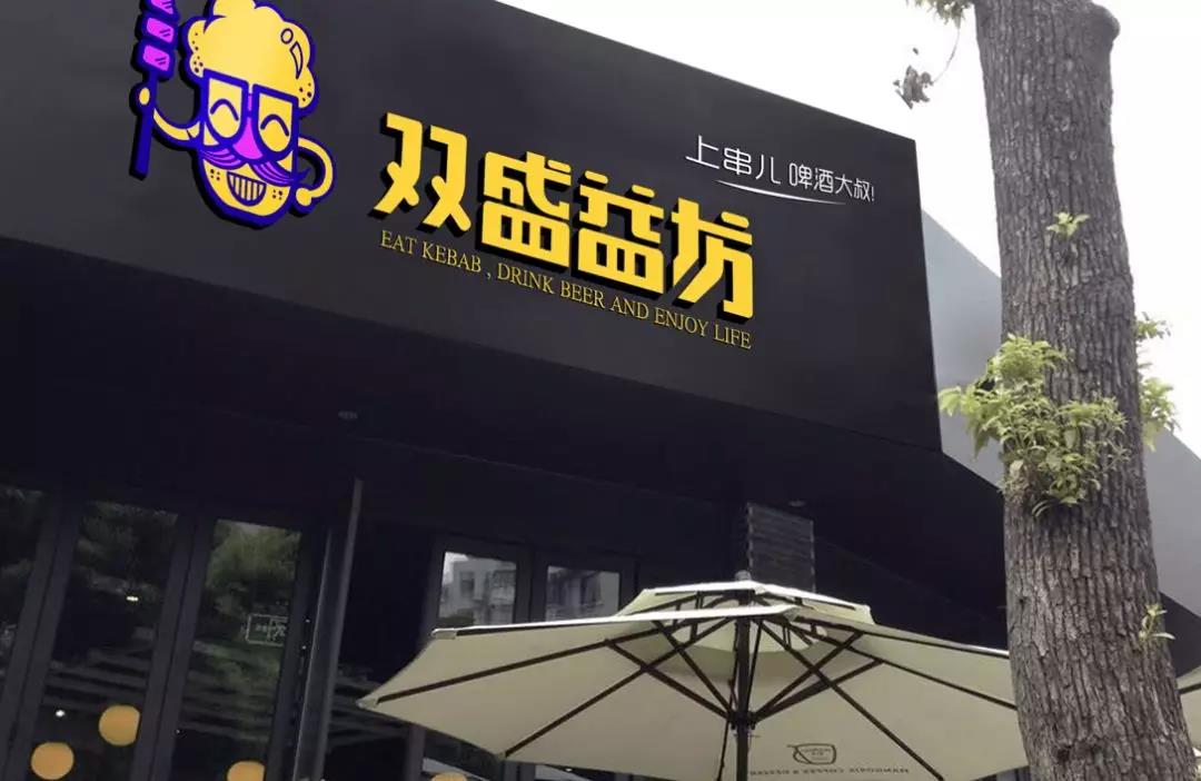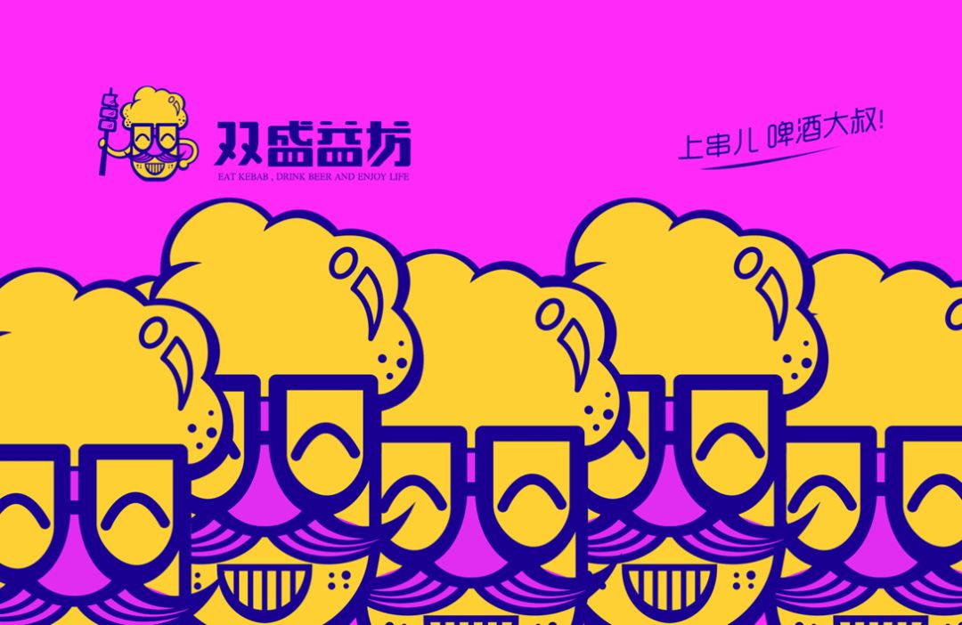 其黑色的招牌底搭配亮眼的黃色,使品牌更顯年輕有活力,slogan“上串兒,啤酒大叔”,親切的語氣凸顯了品牌與顧客的親近感。主視覺形象的設計融合了烤串+啤酒+大叔,啤酒和胡子大叔的矢量輪廓完美地結合,營造出幽默有趣且嘻哈風的啤酒大叔形象,通過墨鏡與胡子拼接成“雙”字,呼應了品牌名稱“雙盛益坊”。大膽地使用黃、紫對比色作為品牌主色調,造成吸睛的視覺效果,且突出LOGO形象,筆畫粗細的變化豐富了主視覺形象,使其變得更有層次感。