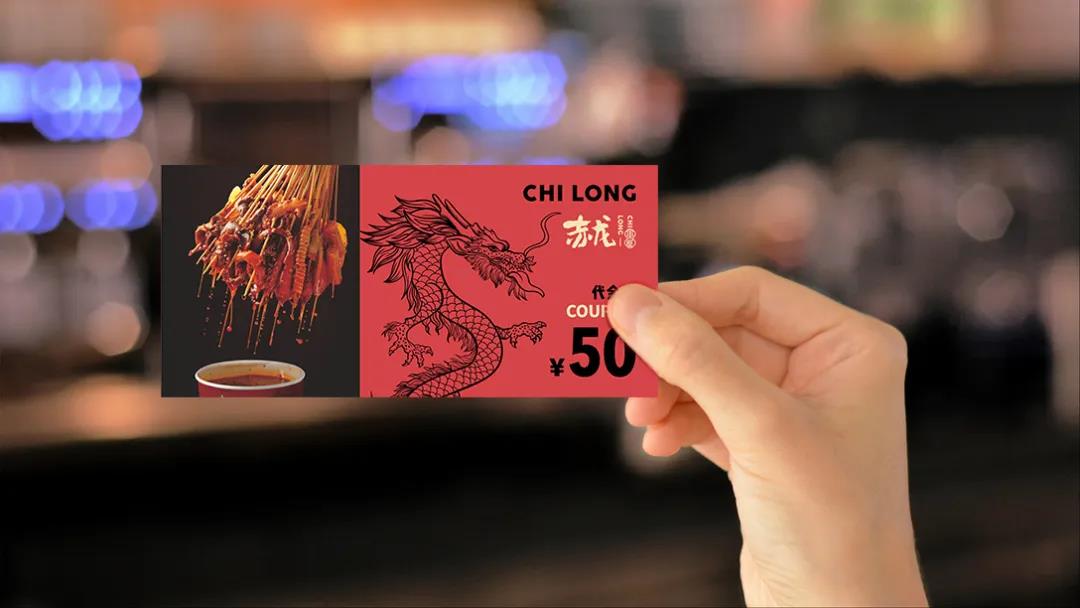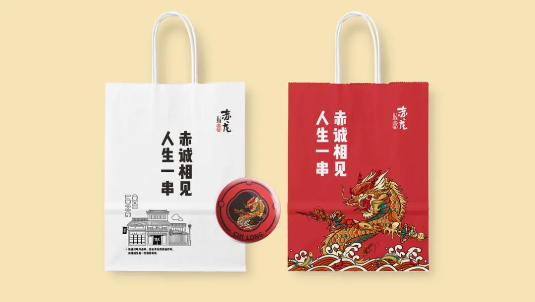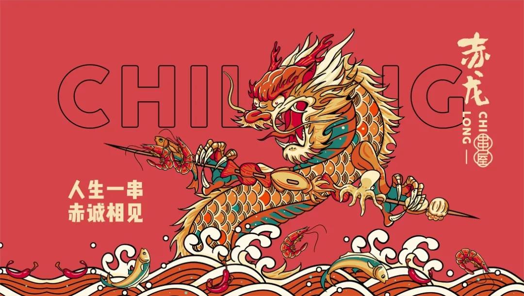 這個炸串品牌叫赤龍炸串,圍繞赤龍的品牌名,原創手繪出一條翻江倒海,爪持串物的龍形象。LOGO設計是中文字體和拼音的結合,赤龍二字用毛筆揮斥而成,赤龍的拼音在和串屋二字連結,重在突出赤龍的品牌名稱。輔助圖形采用日式匠心經典“燒鳥”造型,結合本地傳統炸串,演繹誕生出新一代解饞美味。