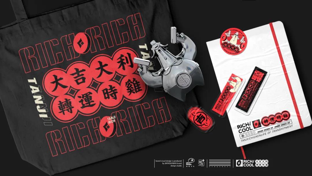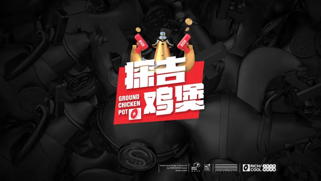 品牌的LOGO圖案是一只帶著盔帽、雙翅拿著手槍的金色立體雞形象,探出方形的紅色底色,探吉雞煲四字兩兩上下分布,字體線條粗大寬扁,頗有種財大氣粗的感覺,小銅錢在左下角與英文組合,使LOGO的呈現形態更加統一完整。因為與吉利、財神等掛鉤,所以品牌在用色上選取了財神紅,搭配銅錢質感的金屬灰杏色,黑色用于強調氛圍感。